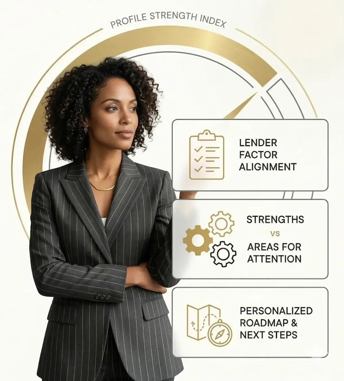 A focused 4–5 minute assessment that shows you exactly how a lender is likely to view your profile so you can move forward with clarity, not guesswork.